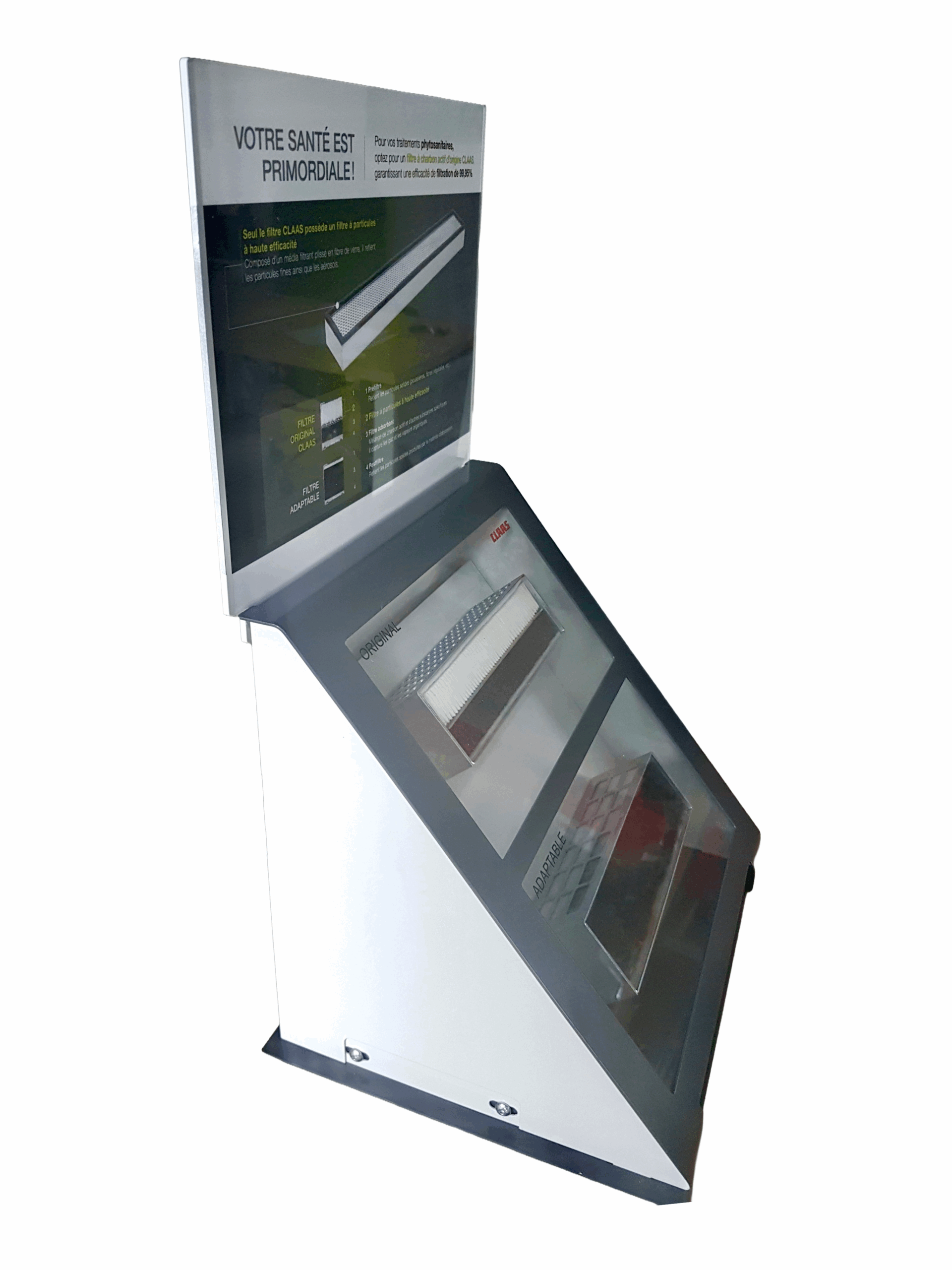 par rapport aux produits standards du marché. Grâce à une , il permet aux clients de comprendre immédiatement les avantages des filtres CLAAS.En effet, ce présentoir expose deux écorchés de filtres à air : un produit CLAAS et un produit standard. Découpés pour en révéler le contenu, ces filtres sont positionnés derrière une vitrine en plexiglas imprimé, qui met en avant les différences de qualité et de conception. De plus, un