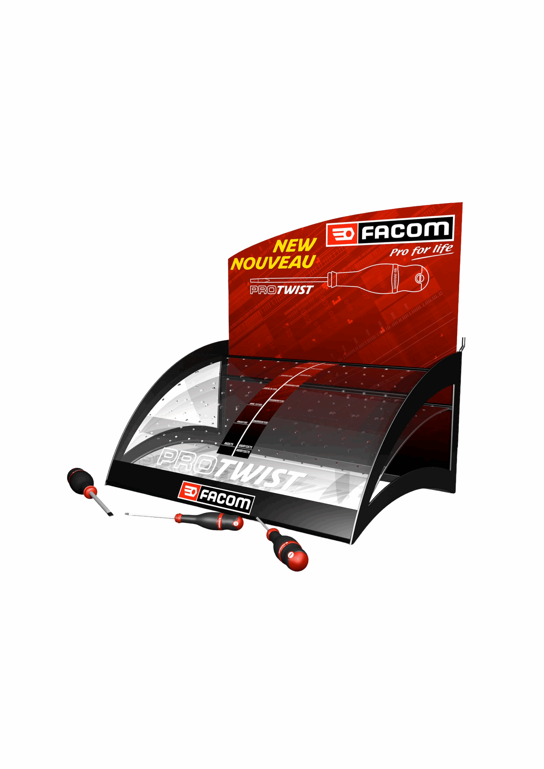 Le présentoir de comptoir FACOM est spécialement conçu pour mettre en valeur la gamme de tournevis PROTWIST chez les distributeurs professionnels et en grande surface de bricolage (GSB). Grâce à sa