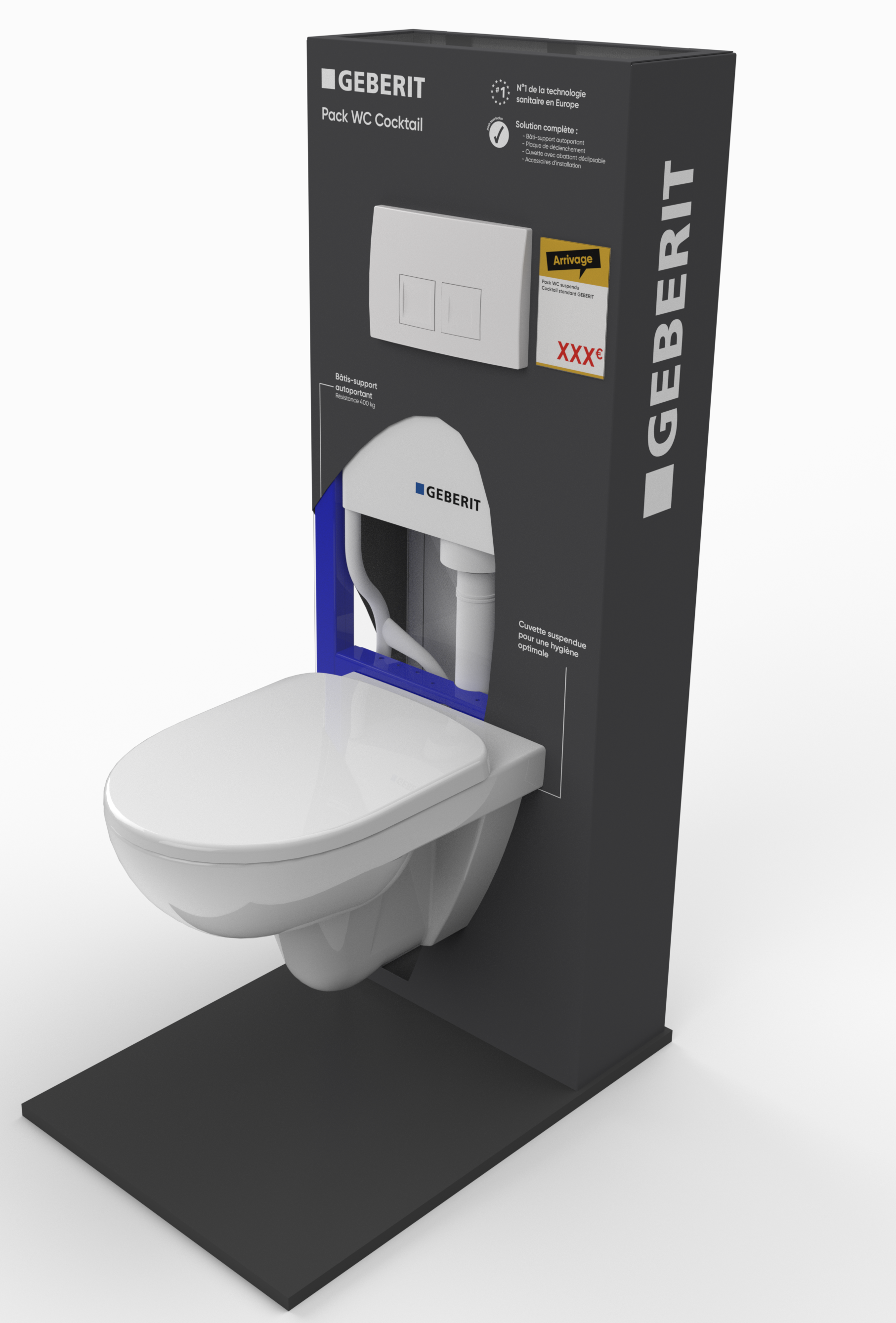 Avec ce présentoir de sol pour Pack WC Cocktail, GEBERIT renforce sa présence en point de vente. Ce support PLV met en avant non seulement l’esthétique du produit, mais aussi la qualité et la technicité de la marque.