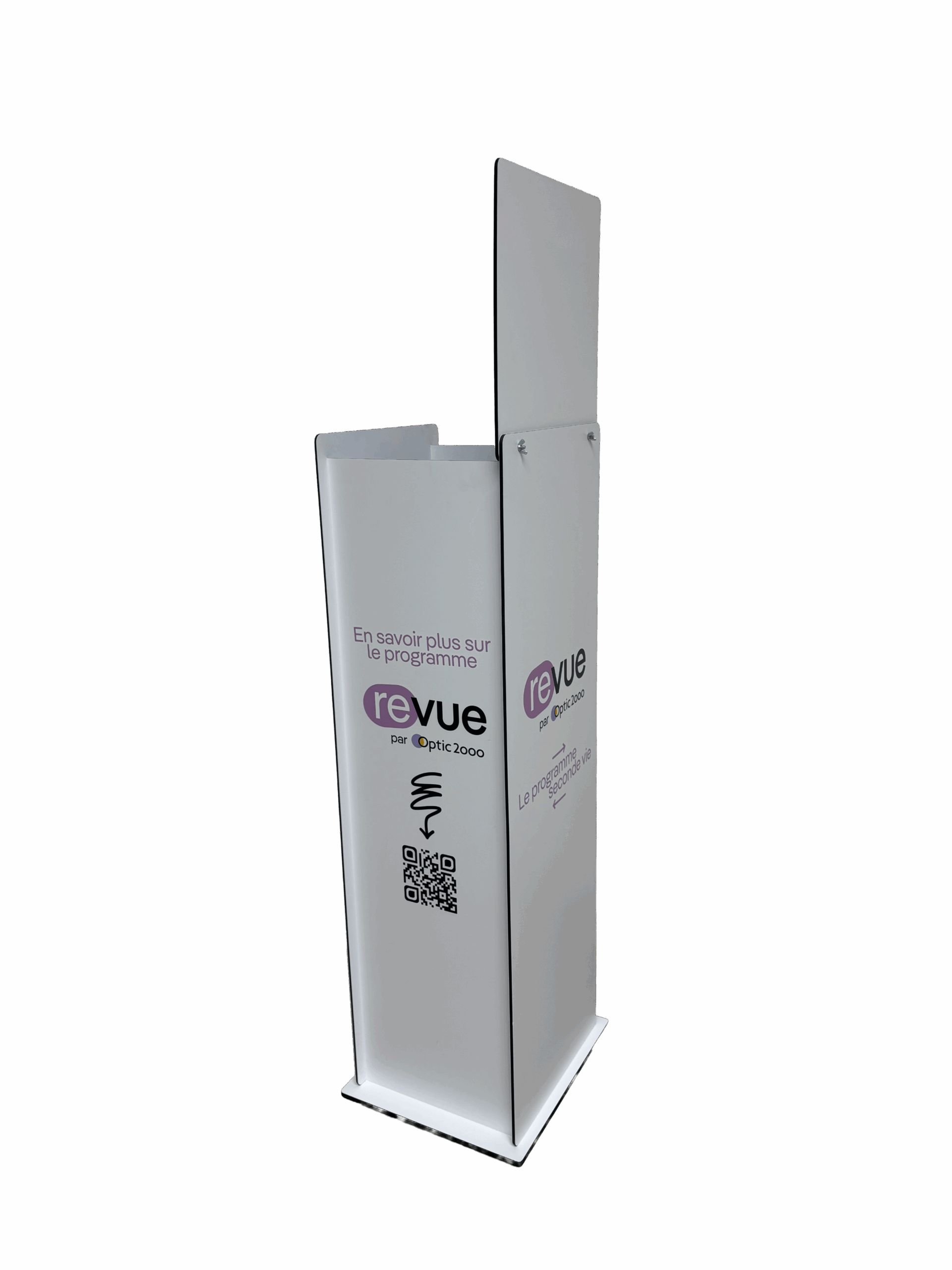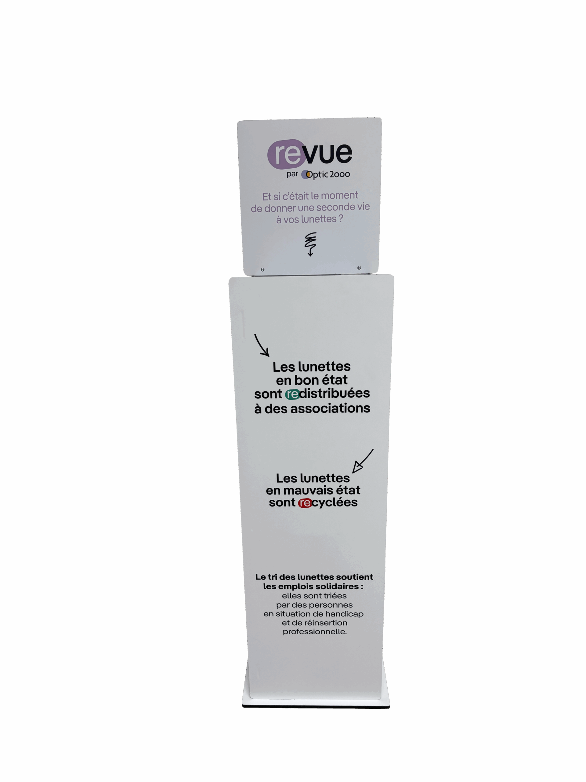 auprès des opticiens, grâce à :L’urne Optic 2000 est la solution parfaite pour les opticiens souhaitant promouvoir le recyclage des montures tout en renforçant leur image durable. Compacte, esthétique et facile à utiliser, elle s’intègre parfaitement dans les boutiques et sensibilise les clients à l’économie circulaire.