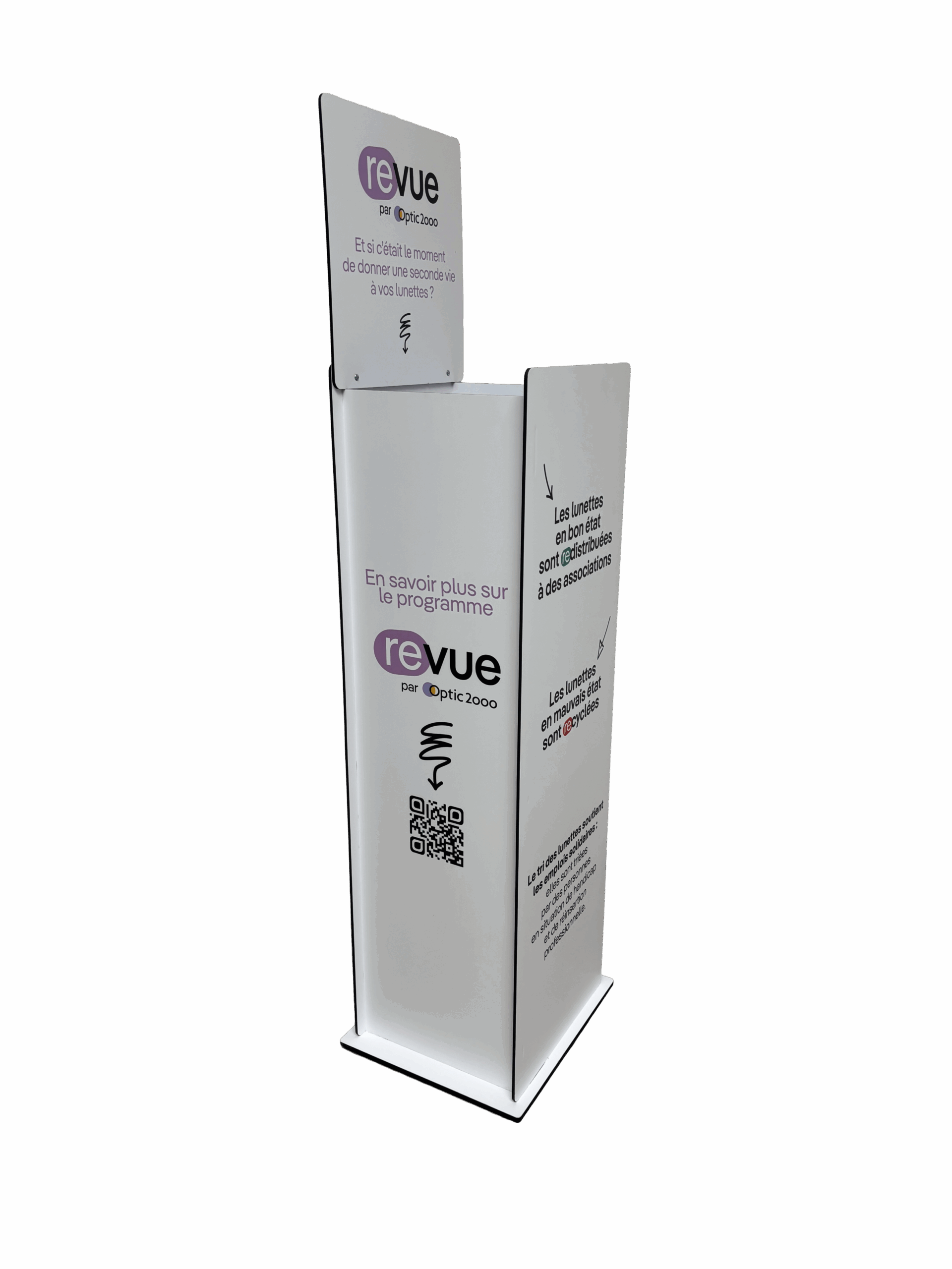 , elle véhicule une image éco-responsable, en parfaite adéquation avec les valeurs RSE d’Optic 2000. Compacte et visible, elle s’intègre facilement dans les espaces de vente tout en sensibilisant les clients au recyclage des montures.
