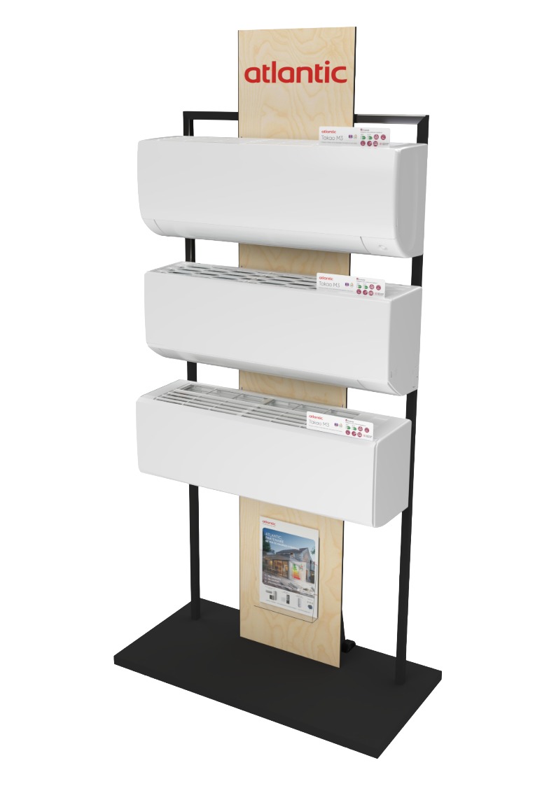 Ce présentoir de sol pour climatiseurs ATLANTIC met en valeur les unités intérieures de manière attractive et professionnelle. Évolutif, robuste et facile à personnaliser, il s’adapte à tous les besoins et renforce l’impact des produits en magasin.